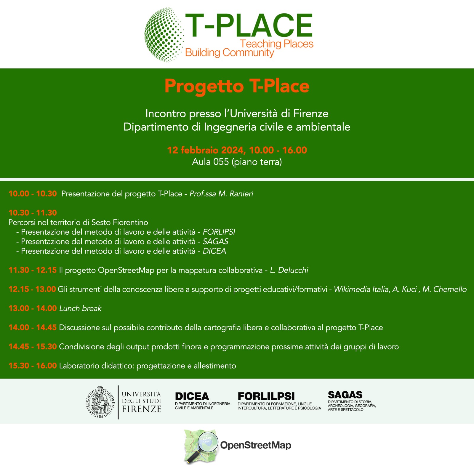 La prof.ssa Grazia Tucci e la dott.ssa Valentina Bonora del Dipartimento di Ingegneria Civile e Ambientale (DICEA) dell'Università di Firenze hanno organizzato, nell'ambito del progetto T-PLACE, un seminario sul possibile contributo della cartografia libera e collaborativa al progetto.